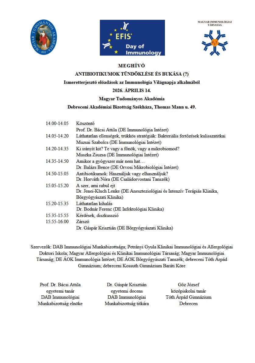 „ANTIBIOTIKUMOK TÜNDÖKLÉSE ÉS BUKÁSA (?) – Ismeretterjesztő előadások az Immunológia Világnapja alkalmából” Helyszín: MTA DAB Székház