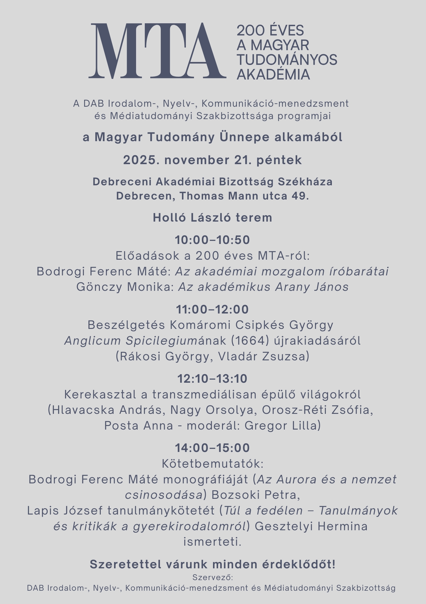 A Magyar Tudomány Ünnepe alkamából bemutatkozik a DAB Irodalom-, Nyelv-, Kommunikáció-menedzsment és Médiatudományi Szakbizottsága Helyszín: MTA DAB Székház Program
