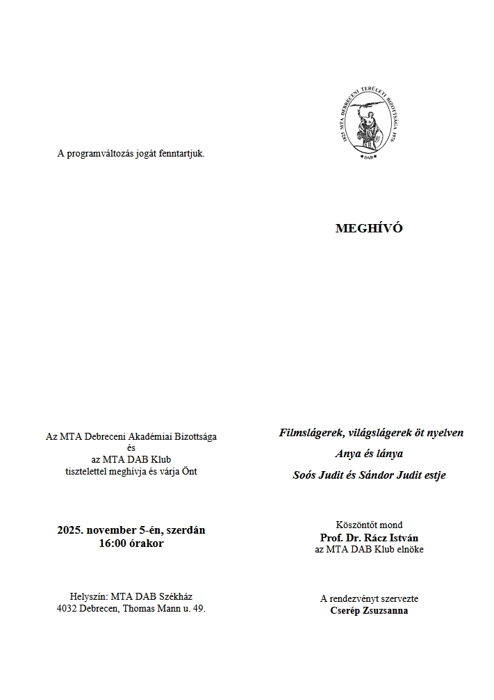 MTA DAB Klub: Filmslágerek, világslágerek öt nyelven Anya és lánya Soós Judit és Sándor Judit estje Helyszín: MTA DAB Székház Program