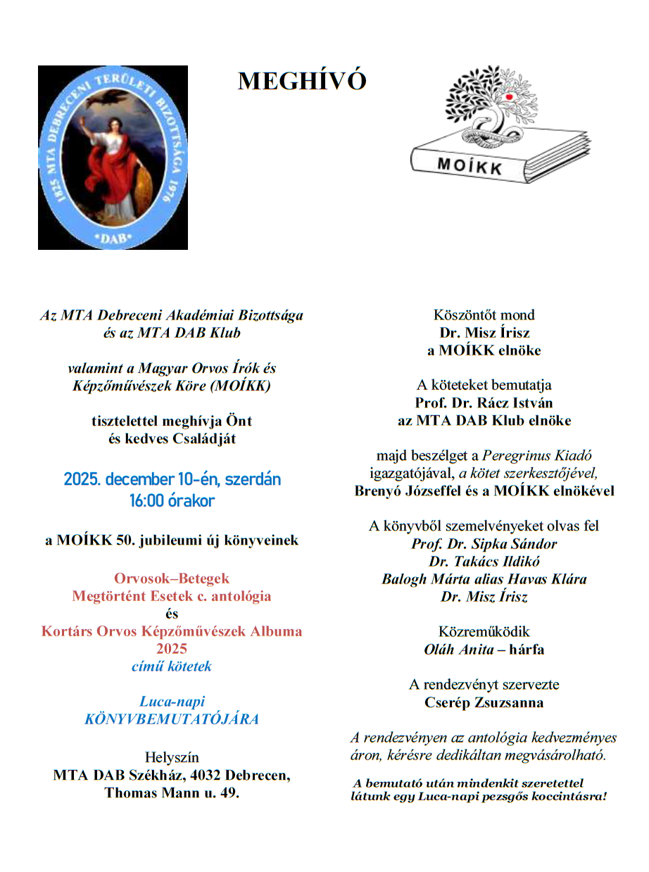 MTA DAB Klub: Orvos-Betegek megtörtént esetek A Magyar Orvos Írók és Képzőművészek Köre 50 éves jubileumi kiadvány bemutatója Helyszín: MTA DAB Székház Meghívó