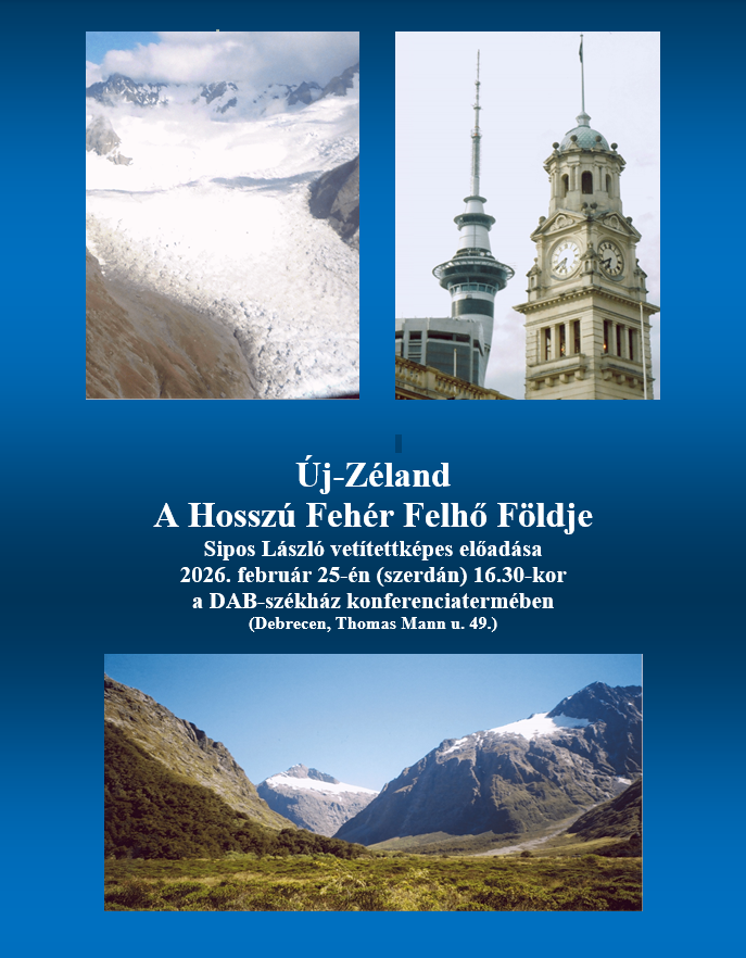MTA DAB Klub: Új-Zéland - a Hosszú Fehér Felhő Földje. Sipos László vetítettképes előadása Helyszín: MTA DAB Székház