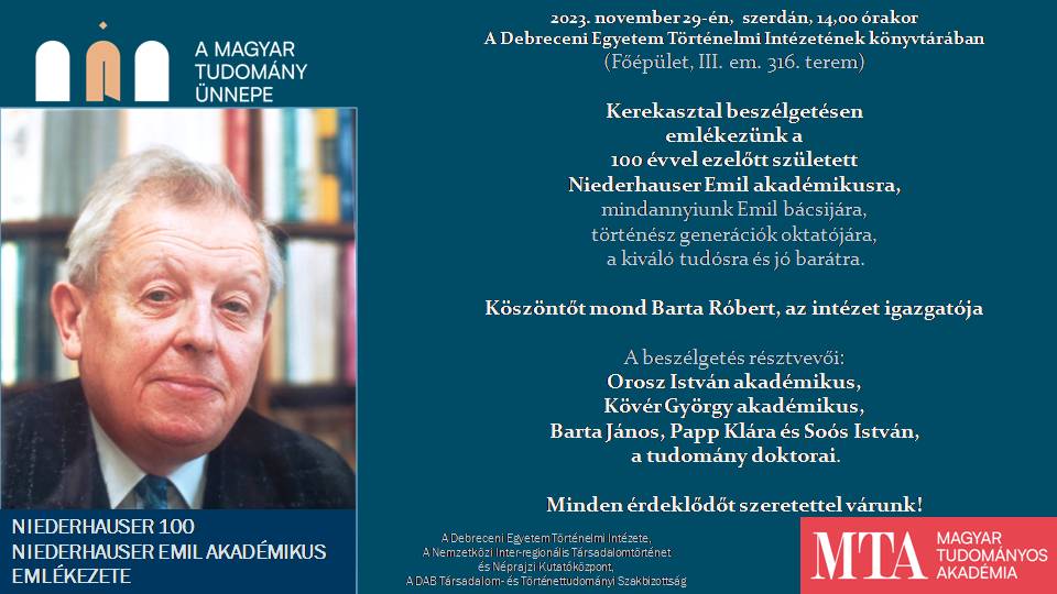 Niederhauser Emil 1951-től több évtizeden át volt a Kossuth Lajos Tudományegyetem Történelmi Intézetében az egyetemes történelem oktatója, s az MTA Történettudományi Intézetének vezető kutatója. Számtalan hasznos és fontos tudományos munkát írt Kelet-Európa történeti útjáról, a többnemzetiségű birodalmak sorsát meghatározó politikusokról, megalapozva ezzel az összehasonlító Kelet-Európa kutatásokat. A térség nyelveinek ismeretében foglalkozott az orosz birodalom és kultúra történetével, a balkáni népek történeti múltjával és a térség háborúval, a jobbágyfelszabadítással és a nemzetiségi kérdéssel, a történeti fejlődés regionális meghatározóival. A debreceni tanszék munkatársaira nagy hatással volt a tudományos kapcsolatok ápolásával, a térség kutatásában elért kimagasló eredményeivel, szemléletével, pontosságával, a tehetségek felkarolásával. Egykori munkatársai és tanítványai méltatják a 100 éve született Niederhauser Emil munkásságát, hagyatékát, emlékeznek barátságára.
