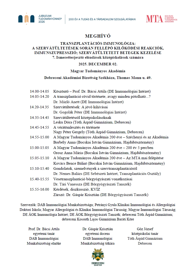 MTÜ: TRANSZPLANTÁCIÓS IMMUNOLÓGIA: A SZERVÁTÜLTETÉSEK SORÁN FELLÉPŐ KILÖKŐDÉSI REAKCIÓK, IMMUNSZUPRESSZIÓ; SZERVÁTÜLTETETT BETEGEK KEZELÉSE 7. Ismeretterjesztő előadások középiskolások számára Helyszín: MTA DAB Székház Program