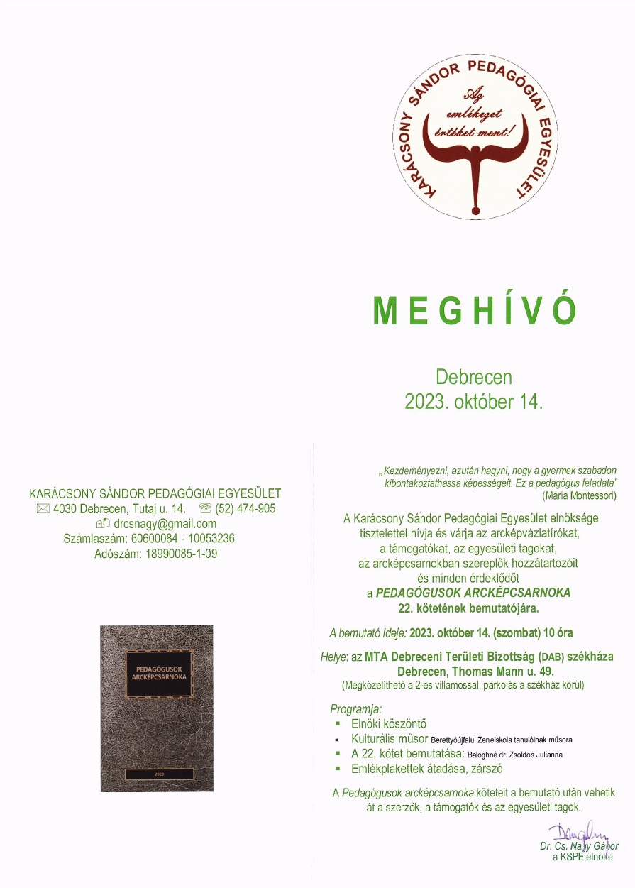 A Karácsony Sándor Pedagógiai Egyesület elnöksége tisztelettel hívja és várja az arcképvázlatírókat, a támogatókat, az egyesületi tagokat, az arcképcsarnokban szereplők hozzátartozóit és minden érdeklődőt a Pedagógusok Arcképcsarnoka 22. kötetének bemutatójára.