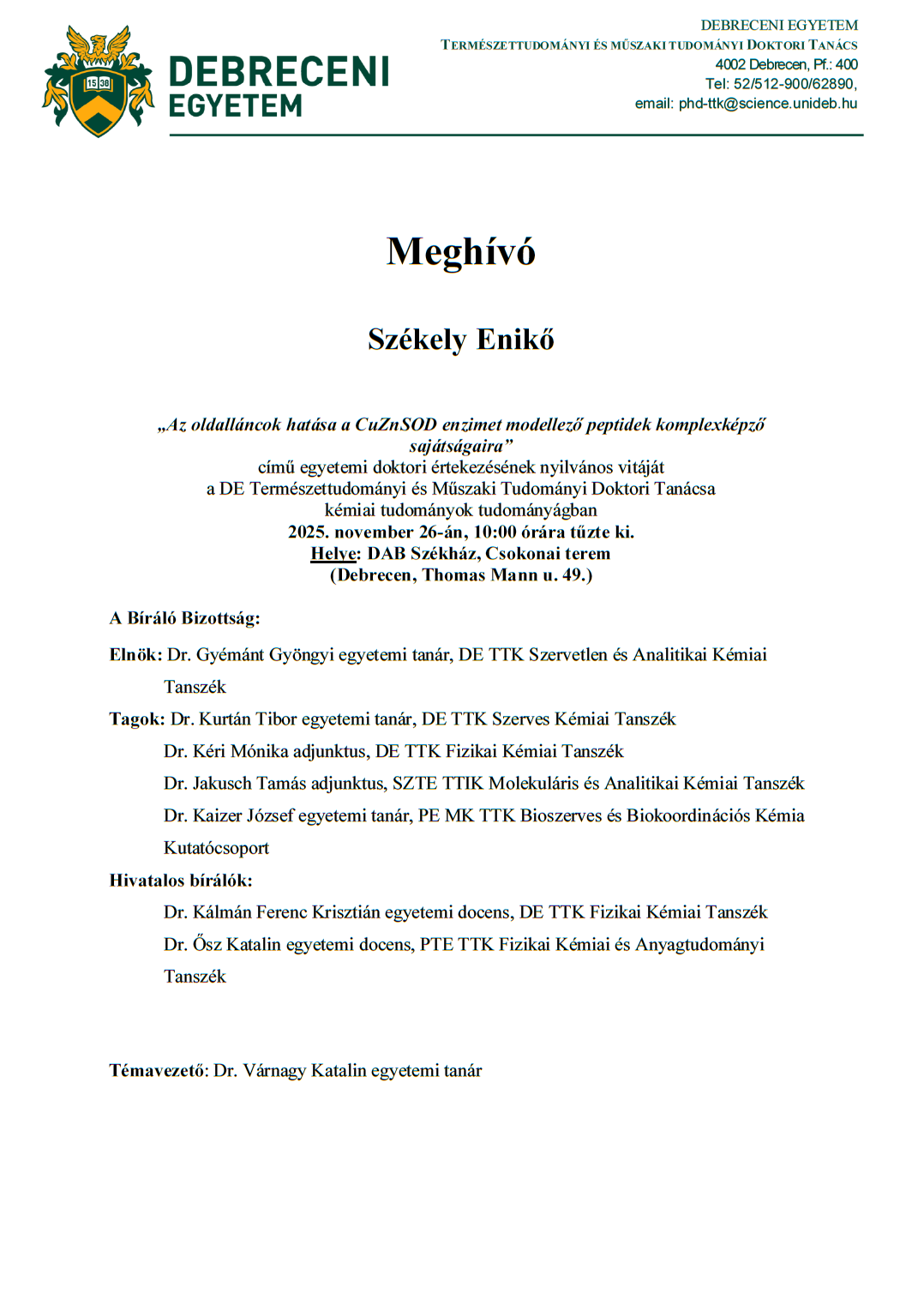 Székely Enikő „Az oldalláncok hatása a CuZnSOD enzimet modellező peptidek komplexképző sajátságaira” című egyetemi doktori értekezésének nyilvános vitája Helyszín: DAB Székház Meghívó