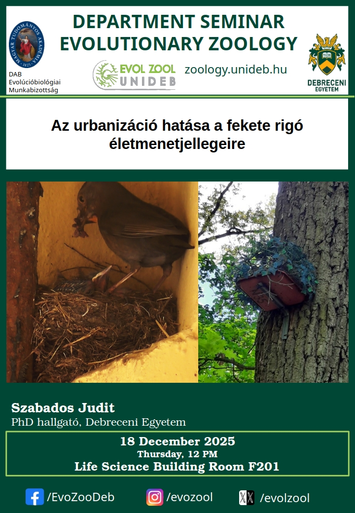 Tanszéki szeminárium/DE EvolZoo Seminar: Az urbanizáció hatása a fekete rigó életmenetjellegeire Helyszín: Élettudományi Épület, 2. szakasz, földszint, Udvardy terem (F201)
