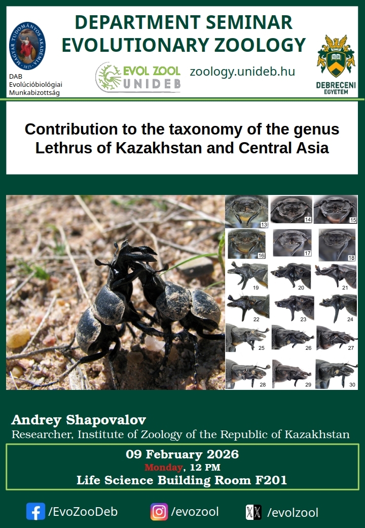Tanszéki szeminárium/DE EvolZoo Seminar: Contribution to the taxonomy of the genus Lethrus of Kazakhstan and Central Asia Location: Life Sciences Building of the University of Debrecen, room F.201