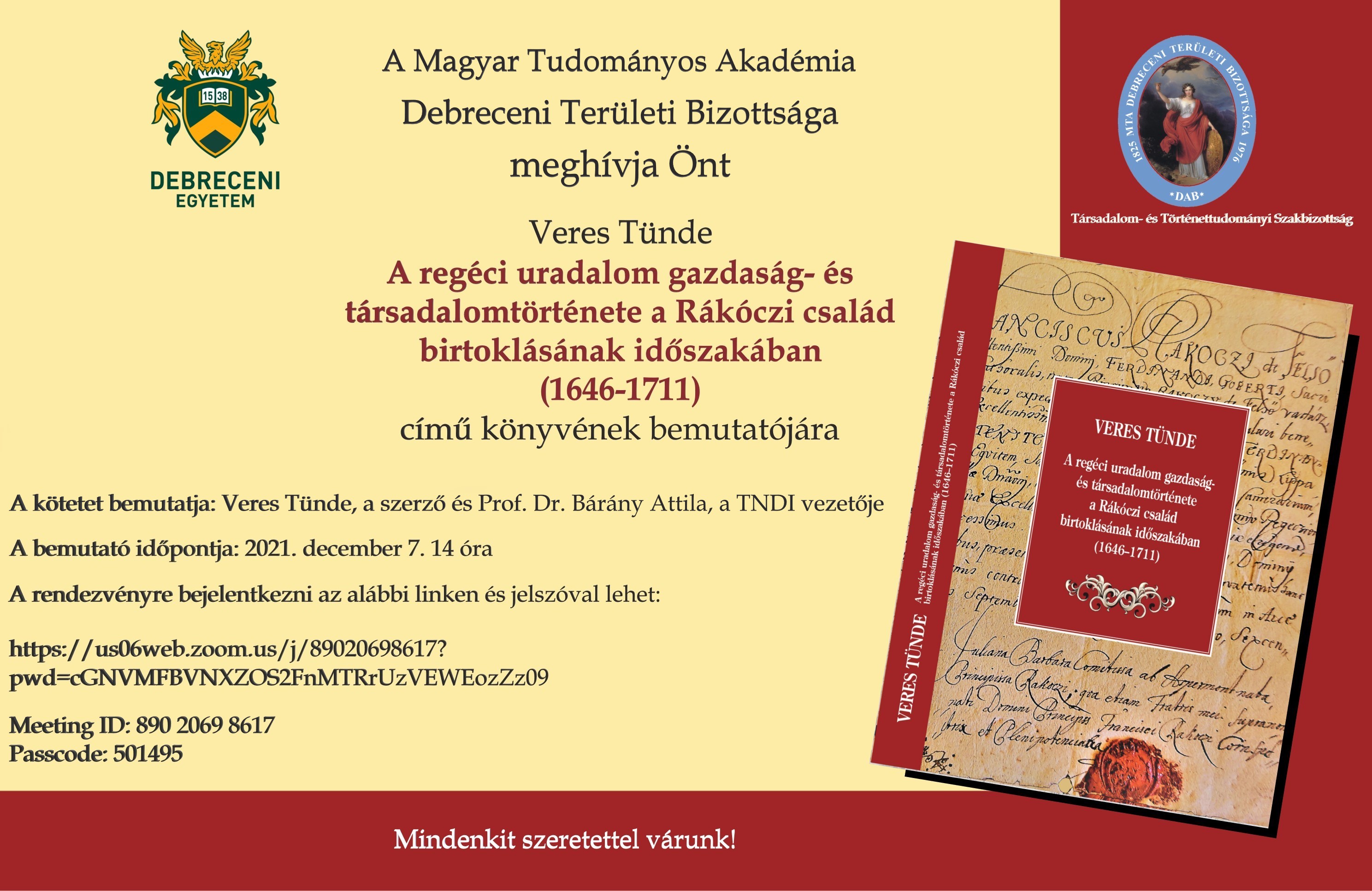 Veres Tünde "A regéci uradalom gazdaság- és társadalomtörténete a Rákóczi család birtoklásának időszakában (1646-1711)" című könyvének bemutatója Online - Zoom Időpont:2021. december 7. 14 óra Helyszín:Online Zoom Megtekinthető:https://youtu.be/b-td1TcWkPQ meghívó