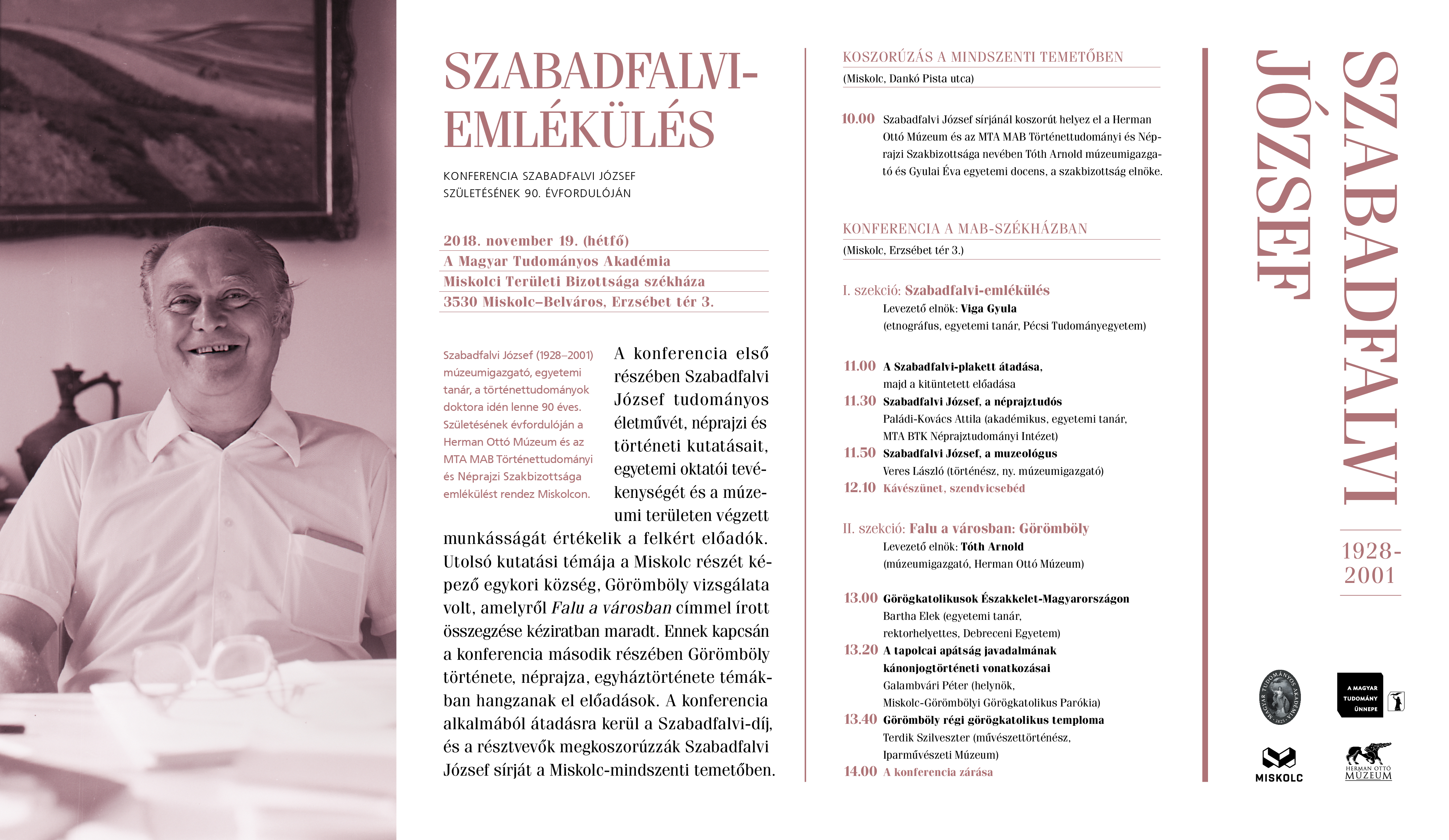 10:00 Szabadfalvi József sírjánál koszorút helyez el a Herman Ottó Múzeum és az MTA MAB Történettudományi és Néprajzi Szakbizottság nevében Tóth Arnold múzeumigazgató és Gyulai Éva egyetem docens, a szakbizottság elnöke.