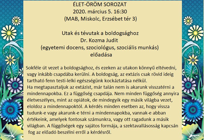 Előadássorozat személyes és társadalmi öröm- és erőforrásainkról a