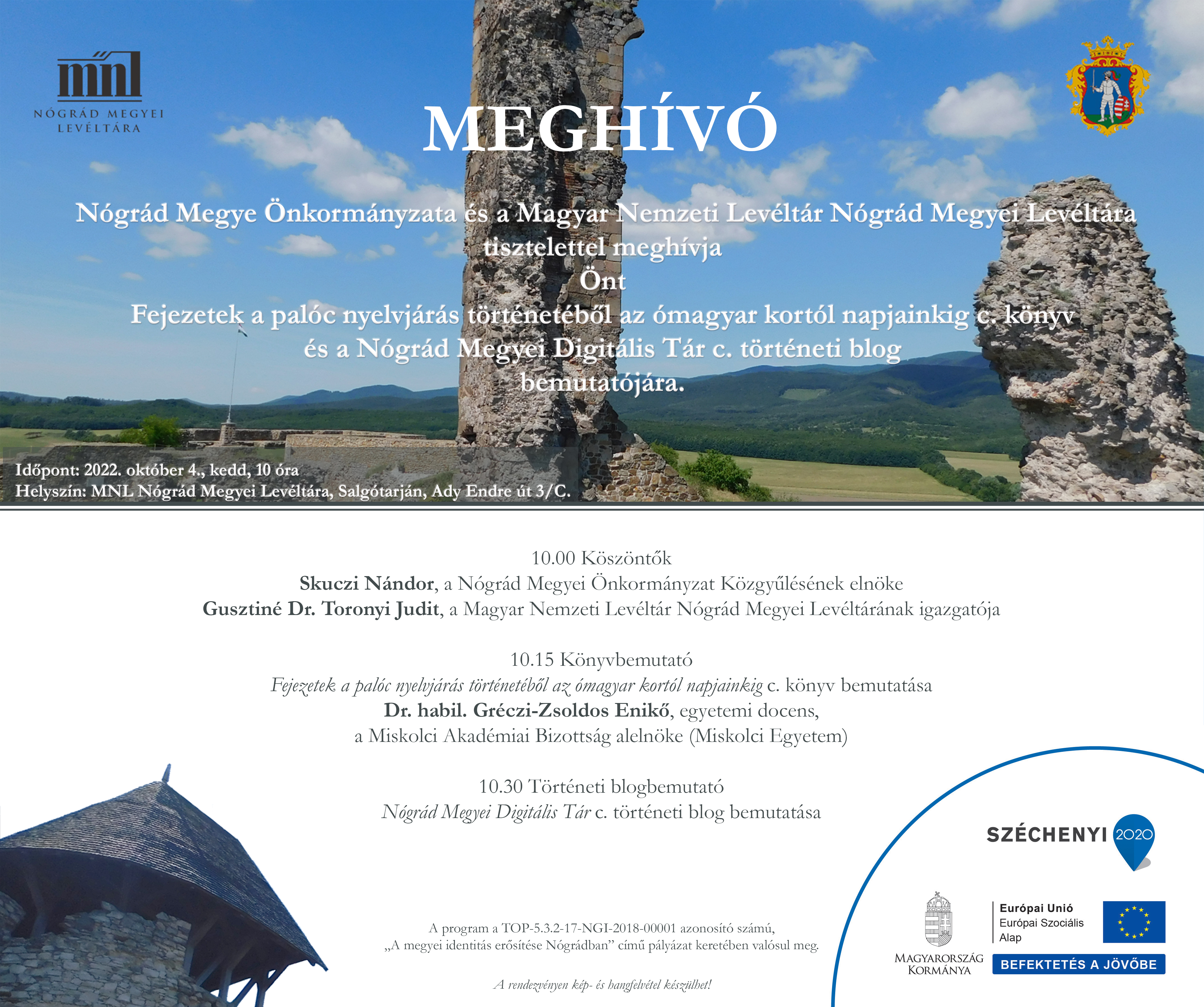 Fejezetek a palóc nyelvjárás történetéből az ómagyar kortól napjainkig c. könyv és a Nógrád Megyei Digitális Tár c. történeti blog bemutatója