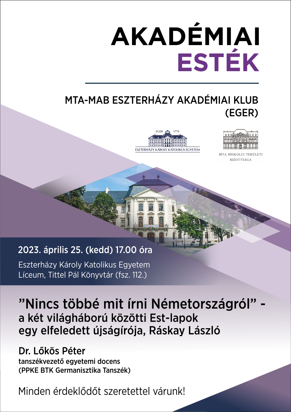 Helyszín: Eszterházy Károly Katolikus Egyetem Líceum, Tittel Pál Könyvtár (fsz.112.)