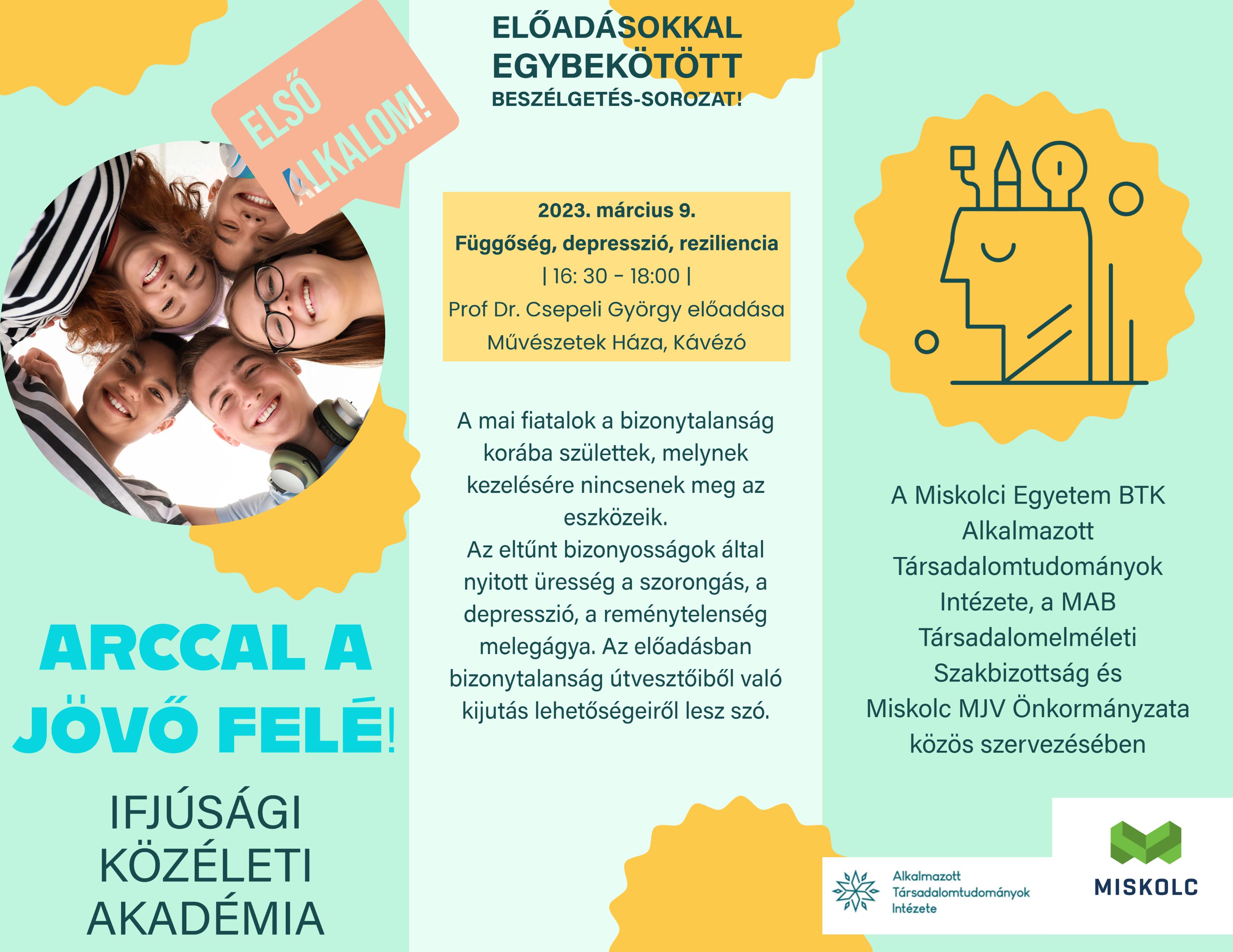 Ifjúsági Közéleti Akadémia Arccal a jövő felé!Ifjúsági Közéleti Akadémia Időpont: 2023. március 9. 16:30Helyszín: Művészetek Háza, Kávézó (Miskolc, Rákóczi F. u. 5.)Prof. Dr. Csepeli György előadásaFüggőség, depresszió, rezilliencia Csepeli Ifjúsági Akadémia.jpg