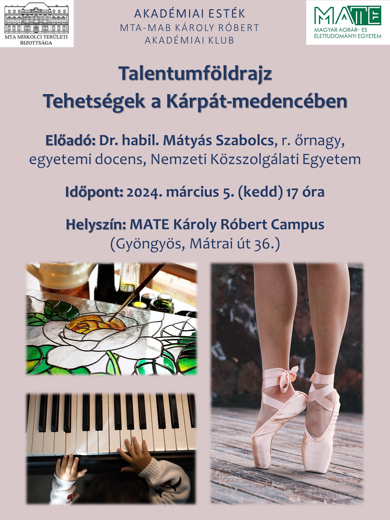 Az előadás közel háromezer magyar és magyar származású tehetség talentumföldrajzi vizsgálatának eredményét mutatja be. A születési hely, a közép- és felsőfokú iskolák, az életpályaszakaszok és a halálozási hely elemzése alapján vizsgálja majd az előadó a Kárpát-medencében a földrajzi törvényszerűségeket. Dr. habil. Mátyás Szabolcs sok egyéb kérdés mellett választ ad majd arra is, hogy milyen okai lehetnek annak, hogy az egyes tudományterületek képviselői között akár több mint tízes éves különbség is megfigyelhető a megélt élettartamban esetében, vagy miért alacsonyabb a reprodukció együttható a tudományos karriert befutott személyeknél.