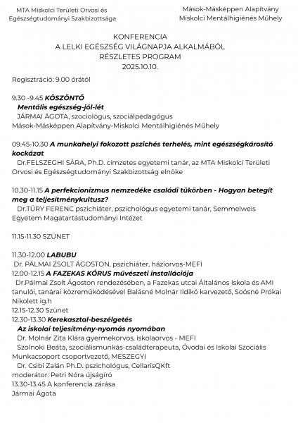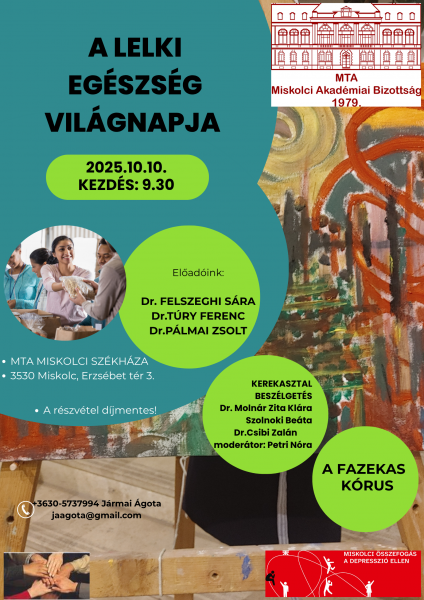 A lelki egészség világnapja Időpont: 2025. október 10. 9:30Helyszín: MTA MAB Székház (Miskolc, Erzsébet tér 3.)