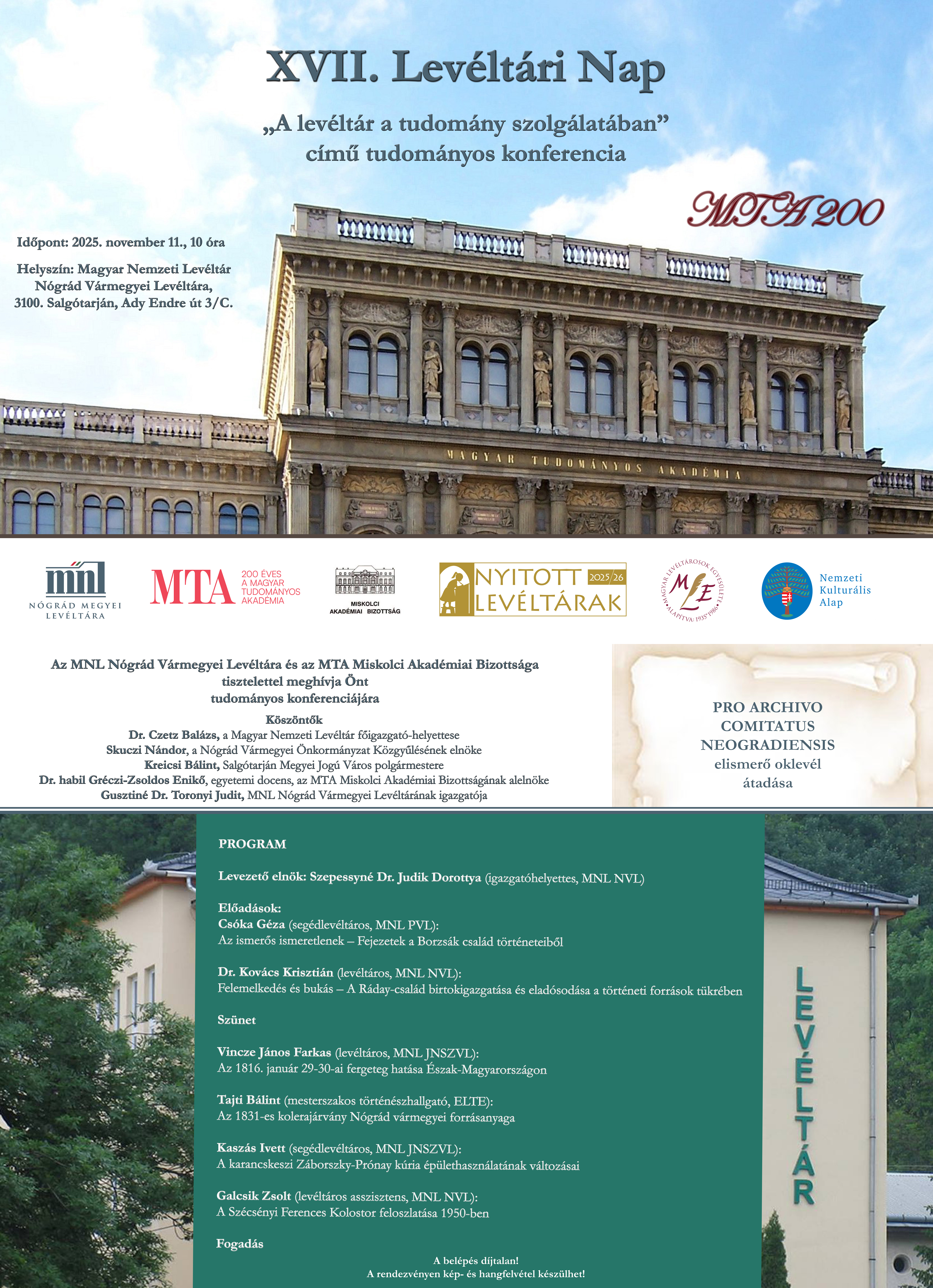 Helyszín: MNL Nógrád Vármegyei Levéltára (Salgótartján, Ady D. út 3/C)