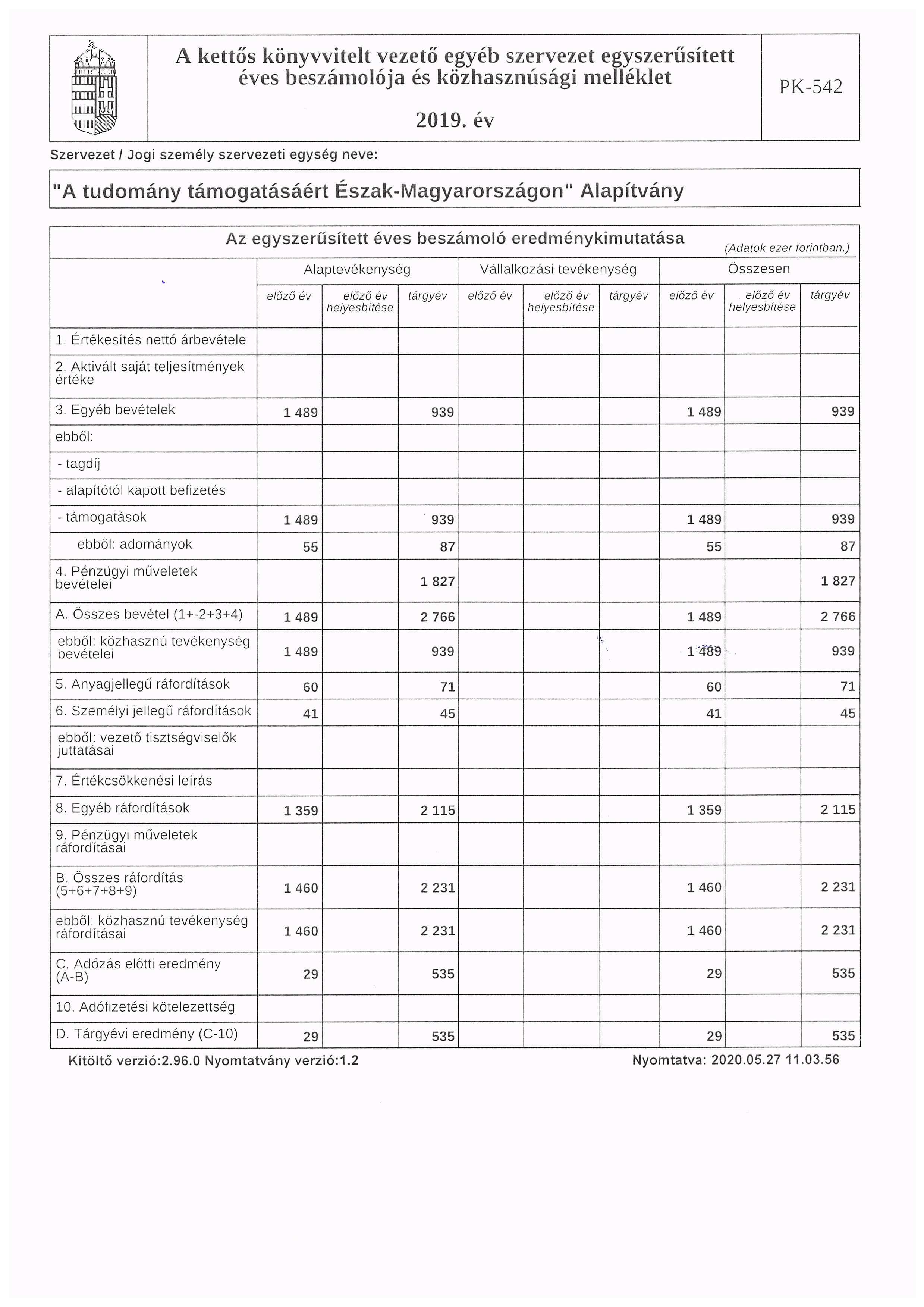 2019. évi eredménykimutatás
