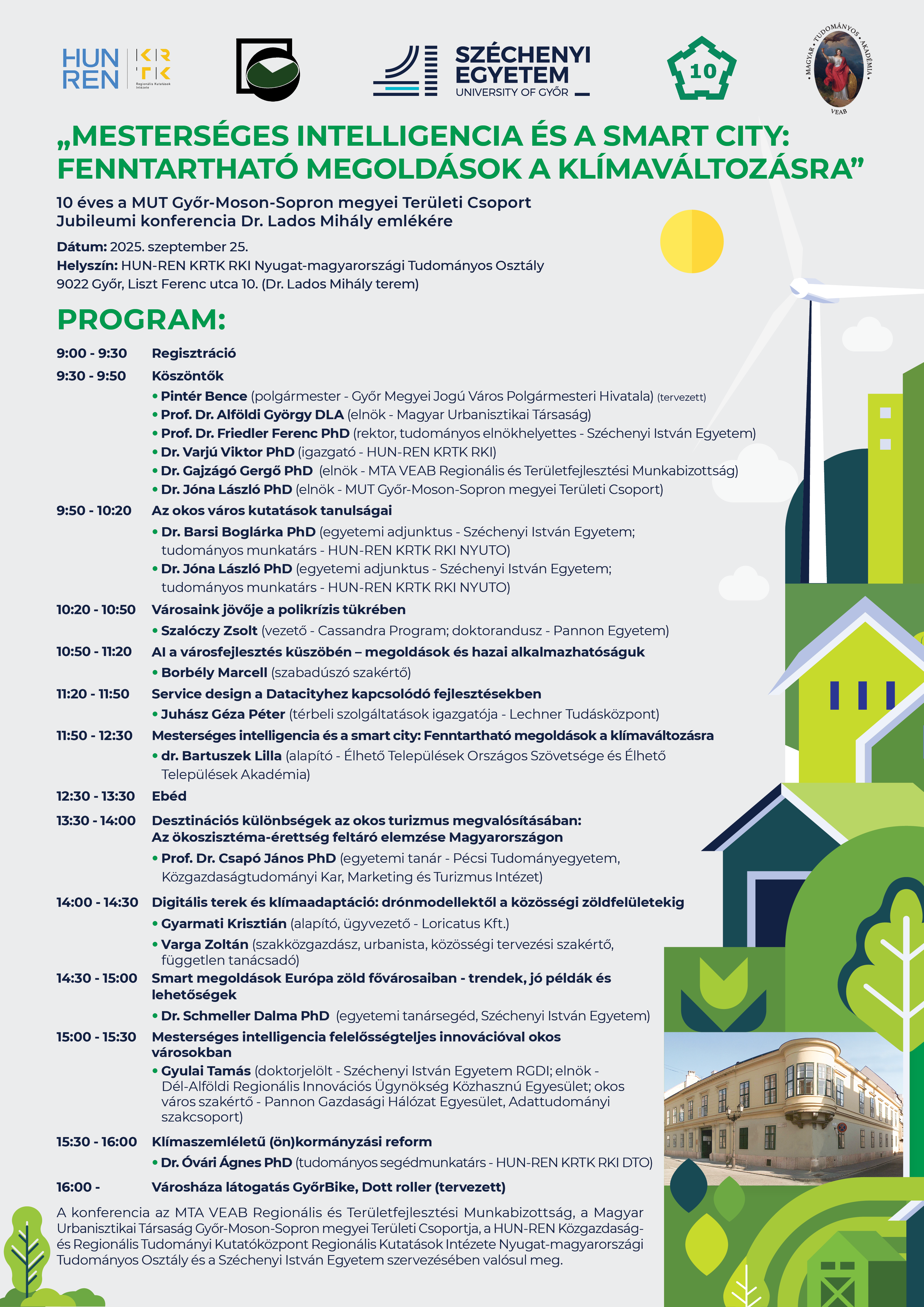 Tisztelettel meghívjuk az MTA VEAB Regionális és Területfejlesztési Munkabizottság, a Magyar Urbanisztikai Társaság Győr-Moson-Sopron megyei területi csoportja és a Széchenyi István Egyetem szervezésében megvalósuló „Mesterséges Intelligencia és a Smart City: Fenntartható megoldások a klímaváltozásra” - 10 éves a MUT Győr-Moson-Sopron megyei területi csoport jubileumi konferencia Dr. Lados Mihály emlékére elnevezésű rendezvényre.