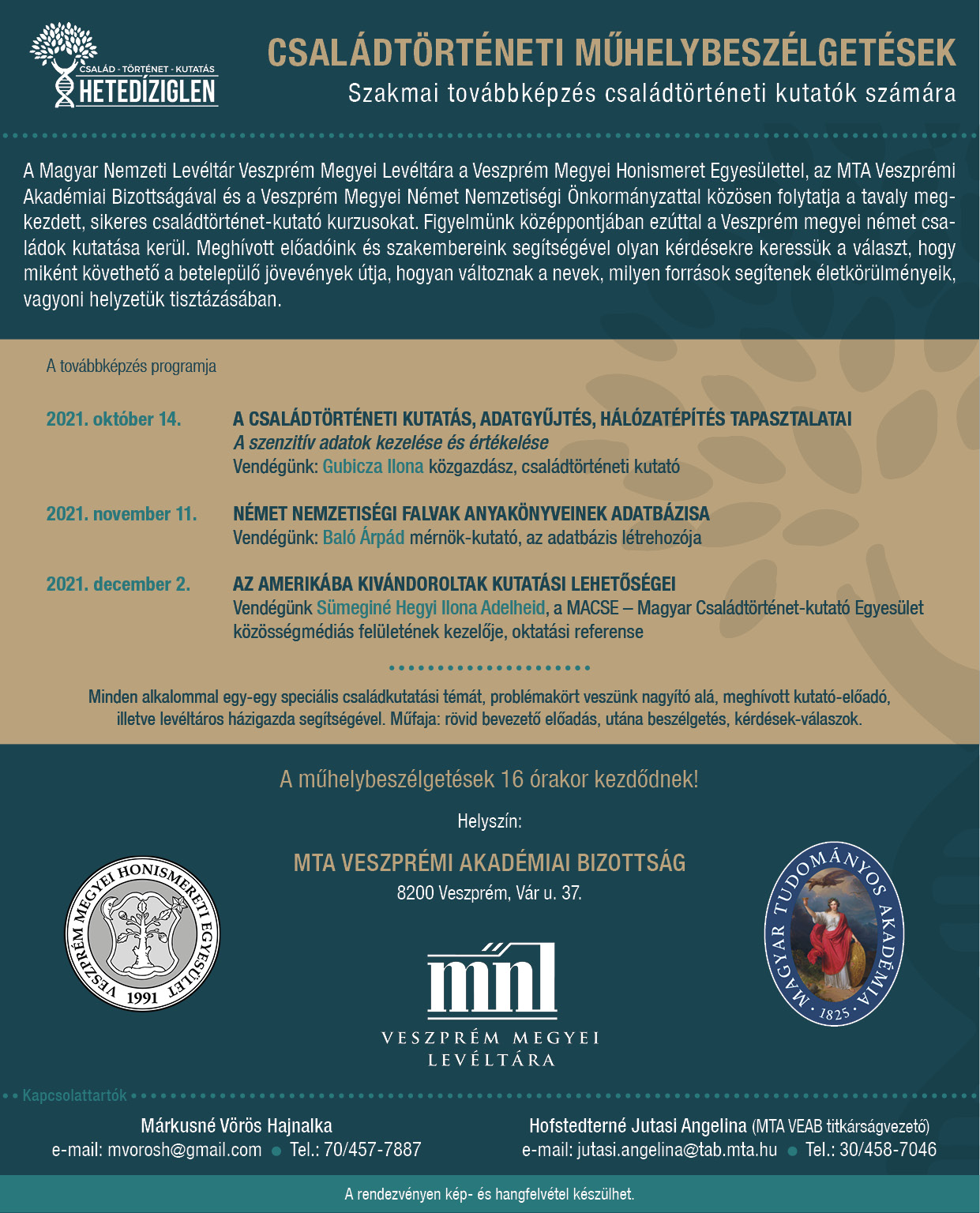 A Magyar Nemzeti Levéltár Veszprém Megyei Levéltára a Veszprém Megyei Honismeret Egyesülettel, az MTA Veszprémi Akadémiai Bizottságával és a Veszprém Megyei Német Nemzetiségi Önkormányzattal közösen folytatja a tavaly megkezdett, sikeres családtörténet-kutató kurzusokat. Figyelmünk középpontjában ezúttal a Veszprém megyei német családok kutatása kerül. Meghívott előadóink és szakembereink segítségével olyan kérdésekre keressük a választ, hogy hogyan követhető a betelepülő jövevények útja, hogyan változnak a nevek, milyen források segítenek életkörülményeik, vagyon helyzetük tisztázásában.