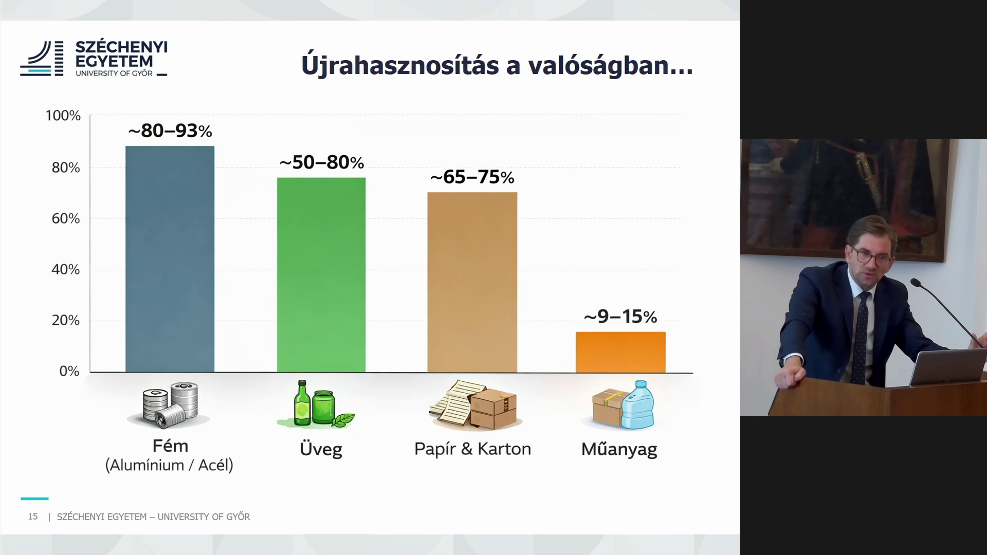 A programban Böröcz Péter professzor úr előadása következett, melynek címe: „Zöld csomagolás vagy zöld illúzió? – A fenntarthatóság dilemmái a szállítási logisztikában”. A Széchenyi István Egyetem egyetemi tanára a szállítás során felmerülő fizikai, mechanikai igénybevételek reprodukálásával foglalkozó akkreditált kutatócsoport vezetője is egyben. A csomagolás funkcióiról, az elmúlt hatvan évben az e téren bekövetkezett jellemzők változásáról, a csomagolóanyagok méretének, összetételének, volumenének alakulásáról, felhasználásáról és újra hasznosításáról beszélt.