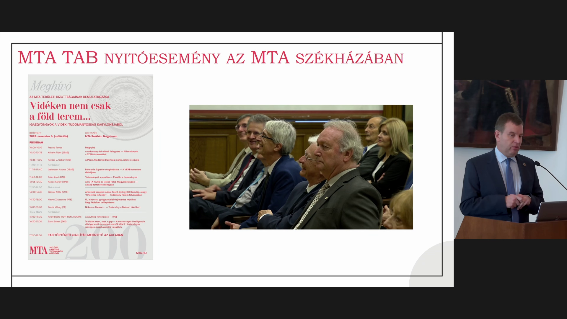 A programban az elnökségi beszámoló következett a VEAB 2025. évi tevékenységéről, melyet Gelencsér András, az MTA VEAB elnöke mutatott be. A kötelező tartalmi elemeken túl tájékoztatást adott a bizottságok tavalyi évben megvalósult kiemelt bicentenáriumi rendezvényeiről, az ehhez kapcsolódó támogatás és szakbizottsági pályázatok felhasználásáról, a VEAB bevételeiről. Kiemelte, hogy a Bizottság továbbra is támogatja a fiatal kutatókat (VEAB Év Kutatója és VEAB Kiemelkedő Ifjú Kutatója pályázatok) és teret ad eredményeik bemutatásának (Pannon Tudományos Napok). Ismertette a VEAB tagjainak 2025. évi állami, regionális és szakmai elismeréseit, majd röviden vázolta a VEAB 2026. évi terveit.